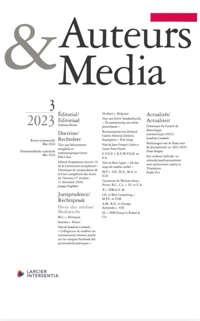 Le dernier numéro de la revue bilingue Auteurs & Media éditée par Larcier-Intersentia qui couvre tous les aspects juridiques du droit d’auteur et du droit des médias vient de paraître. J’y publie ma chronique 2022 du Conseil de déontologie journalistique ainsi qu’un commentaire de l’arrêt CEDH Sanchez c. France sous le titre « L’obligation de modérer les commentaires haineux postés sur les comptes Facebook des personnalités politiques »