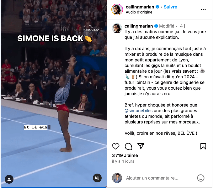 Les thèmes musicaux et tubes internationaux ont la cote aux JO de Paris. La musique a tenu une part centrale lors des compétitions de gymnastique artistique sportive où chaque musique est méticuleusement choisie par les gymnastes. Pour les exercices au sol, la superstar Simone Biles s’est élancée sur une bande son très américaine, avec des titres de Taylor Swift et de Beyoncé. Entre ces musiques, la DJ Calling Marian a eu la surprise d’entendre ses sons. Un fond sonore teinté de bleu-blanc-rouge qui donne un sacré coup de projecteur à l’étoile montante de la scène clubbing parisienne qui dit rêver que tous les artistes puissent vivre dignement de leur musique.