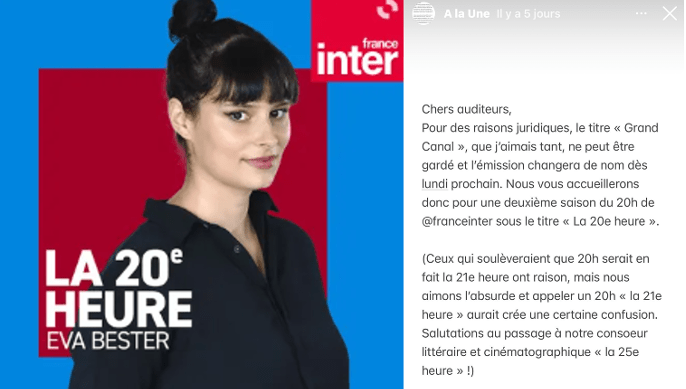 C’est la rentrée sur France Inter, le moment de retrouver « Grand Canal » la délicieuse émission d’Eva Bester, dédiée aux mondes de la culture et des idées. Sauf que la journaliste vient d’informer ses auditeurs que des raisons juridiques l’empêchent de garder le titre de son émission qui doit changer. « Grand Canal » devient « La 20e heure ».