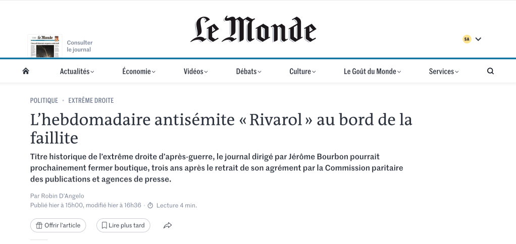 Fière de contribuer au risque de faillite de Rivarol, l’hebdomadaire français d’extrême droite, antisémite, négationniste et raciste.