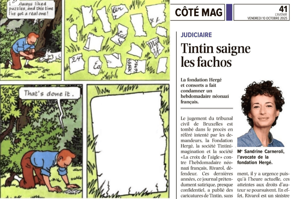 Après les générateurs de couvertures Martine, les mèmes Tintin condamnés pour violation du droit d’auteur. L’hebdomadaire français néonazi Rivarol et l’un de ses dessinateurs, partisan de l’Ordre Nouveau, condamnés à cesser toute exploitation des personnages de l’oeuvre Les Aventures de Tintin. Le tribunal retient qu’il n’y a rien de comique à mettre dans les mains de Tintin un hebdomadaire raciste tel que Rivarol.